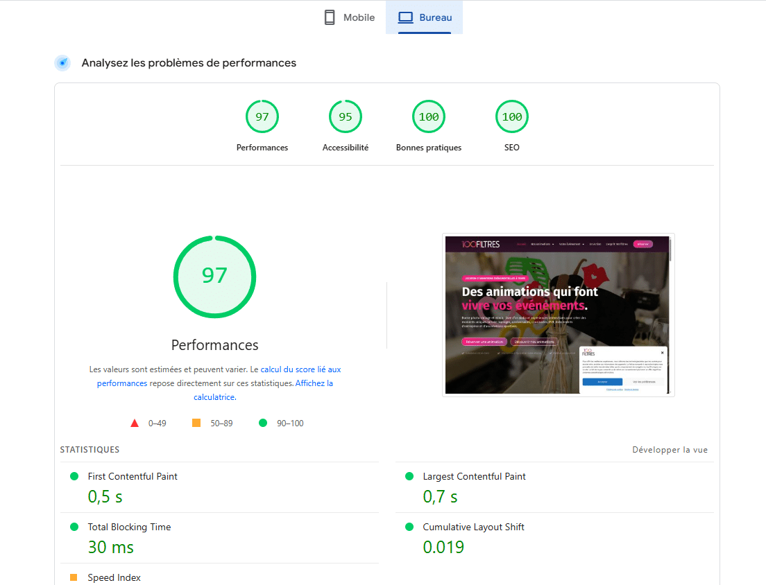 Après le design, j’ai veillé à maximiser les performances techniques du site, en optimisant chaque élément pour qu’il se charge le plus vite possible.